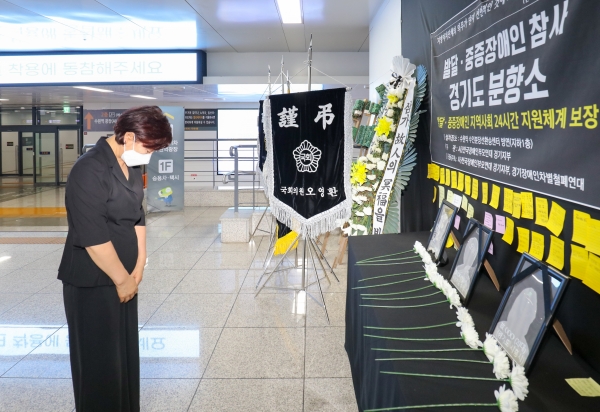 이날 오후 4시 분향소를 찾은 최병일 의장은 헌화와 묵념을 한 뒤, 현장을 지키고 있는 경기장애인부모연대 관계자들과 대화를 나누는 등 슬픔을 함께했다.
