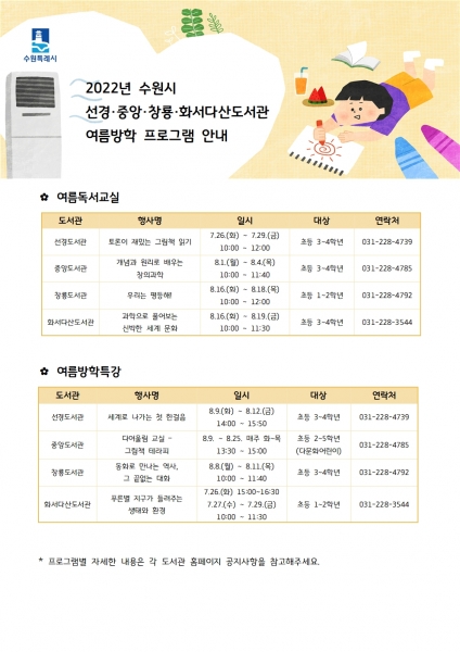 [충청뉴스큐] 수원시 선경·중앙·창룡·화서다산도서관이 여름방학을 맞아 어린이를 대상으로 ‘2022년 여름방학 프로그램’을 운영한다.