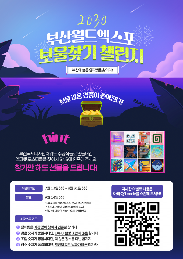 부산시 관계자는 “이번 엑스포 보물찾기를 계기로 여름철 하계휴가를 맞아 부산을 방문하는 관광객들에게 멋진 추억을 선사하고 2030년의 주역이 될 MZ세대에 엑스포와 부산의 매력을 널리 알리는 좋은 계기가 될 것으로 기대한다”고 밝혔다.