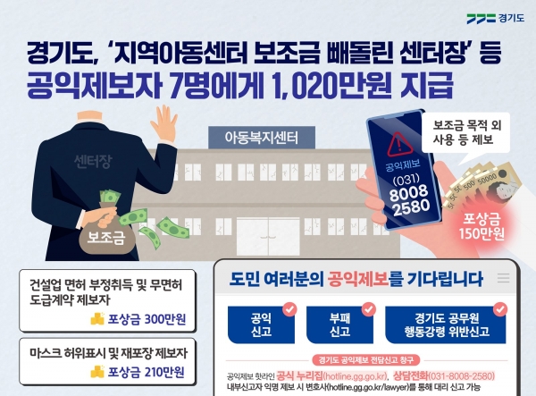 장성근 경기도 공익제보지원위원회 위원장은 “이 제보로 사회적 돌봄이 필요한 아이들에게 사용돼야 할 국가 보조금이 사적으로 사용된 사실이 적발됐다”며 신고자에게 포상금 150만원을 지급하기로 결정했다.