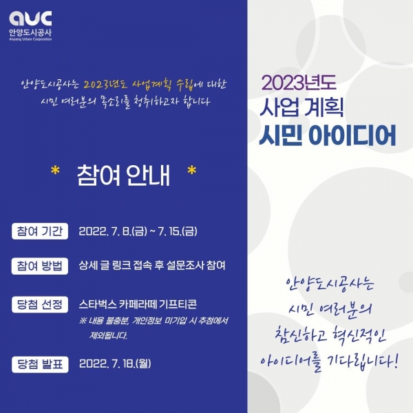 [충청뉴스큐] 안양도시공사는 2023년도 사업계획 수립에 앞서 안양시민의 눈높이에 맞는 혁신경영을 수행하기 위한 ‘시민 아이디어 제안’을 이번 달 8일부터 15일까지 진행한다고 밝혔다.