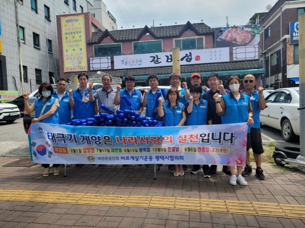 [충청뉴스큐] 평택시 바르게살기운동 서정동위원회는 지난 8일 제헌절을 앞두고 이종안 바르게살기운동 평택시협의회장 및 위원 10여명이 참여한 가운데 평택시 송탄출장소 부근에서 주민들에게 태극기 150여 개를 무료로 나눠주는 ‘태극기 달기 캠페인 및 나눔 행사’를 전개했다.