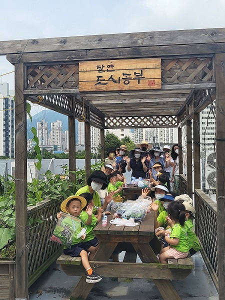 [충청뉴스큐] 무더운 여름날. 안양시 달안동 행정복지센터 옥상 텃밭에서 ‘어린 도시농부’들이 가지, 고추, 토마토, 상추 등을 수확하느라 작은 손길이 어설프고도 분주하게 움직인다.