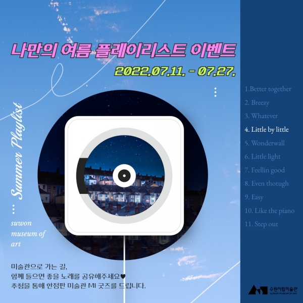 [충청뉴스큐] 경기도 수원시립미술관은 유난히 더운 올여름을 상쾌하게 보내기 위한 SNS 이벤트 ‘나만의 여름 플레이리스트’를 7월 13일부터 7월 27일까지 진행한다.