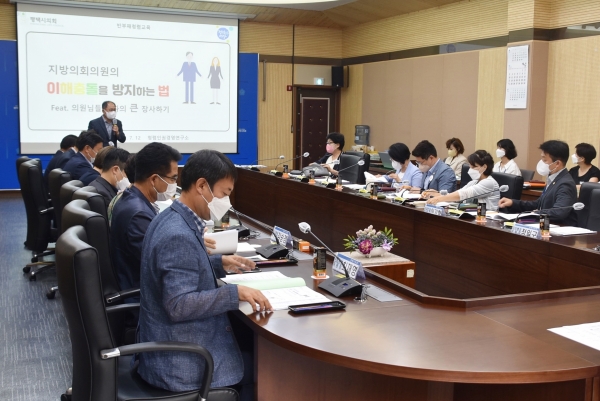 이날 교육은 올 5월 ‘공직자의 이해충돌 방지법’ 시행을 맞아 제9대 의회 의원들의 원활한 의정활동과 사무국 직원들의 직무수행 역량강화를 위해 마련됐다.