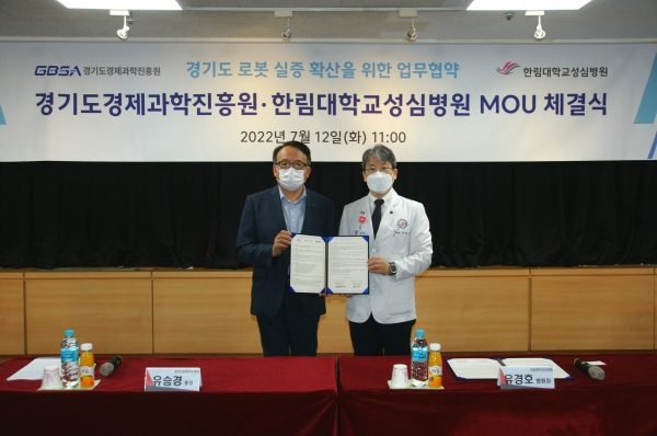 이번 협약식은 유승경 경과원 원장과 유경호 한림대 병원장이 참석한 가운데 진행됐으며 협력을 통해 병원 내외 다종·다수 로봇 실증을 통한 의료진 업무 경감, 재택 치료자 대상 로봇 보급을 통한 긴급 의료 시스템 구축 등 의료현장에서 최신 로봇 기술이 원활하게 사용되도록 힘을 모을 예정이다.
