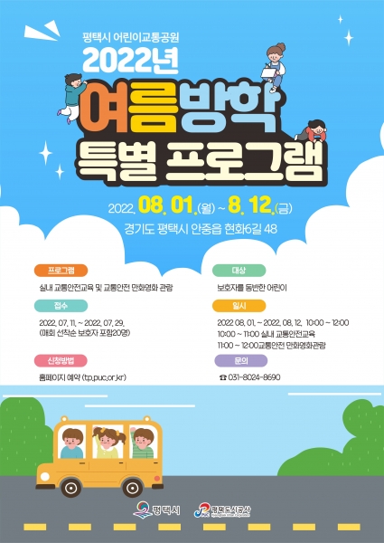 참가 신청은 7월 11일부터 7월 29일까지 평택시 어린이교통공원 홈페이지에서 매회 선착순 20명으로 받으며 가족단위의 개인 접수로만 가능하다.