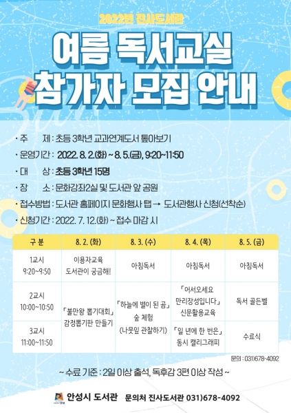 [충청뉴스큐] 안성시 진사도서관에서는 오는 8월 2일부터 5일까지 4일간 ‘초등 3학년 교과연계도서 톺아보기’를 주제로 여름 독서교실을 운영한다.