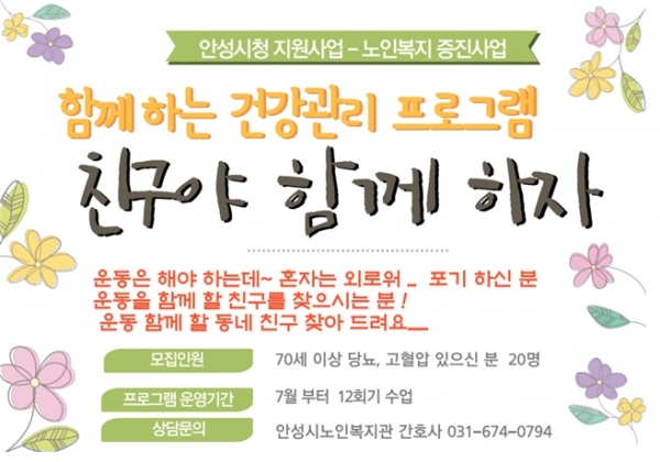 [충청뉴스큐] 안성시노인복지관은 안성시 지원 사업인 ‘2022년 노인복지증진사업’에 선정돼 만성질환을 가진 어르신을 대상으로 건강관리 프로그램 ‘친구야 함께 하자’를 진행할 예정이며 오는 20일까지 해당 사업 참여자를 모집하고 있다고 밝혔다.