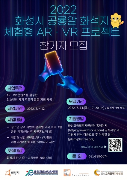 [충청뉴스큐] 화성시인재육성재단 화성교육협력지원센터에서는 오는 20일까지 화성시 관내 중·고등학교 학생을 대상으로 체험형 증강현실, 가상현실 프로젝트 참가자를 모집한다.