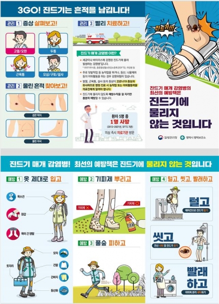 평택보건소 관계자는 “야외활동 후 2주 이내 고열과 설사, 구토 등 소화기 증상이 나타나면 즉시 의료기관에 방문해 야외활동력을 알리고 신속한 진단과 치료를 받아야 한다”며 “평택보건소에서는 홍보활동 및 교육을 지속적으로 전개하는 한편 농림업 종사자 및 읍면동 행정복지센터를 통해 진드기 기피제와 토시를 배부하는 등 감염병 예방에 최선을 다하고 있다”고 말했다.