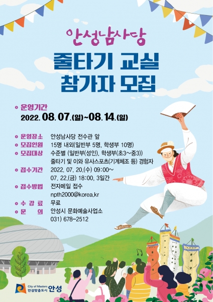 교육은 안성맞춤랜드 내 안성 남사당전수관 앞 마당에서 무료로 진행되며 신청기간은 오는 7월 20일부터 22일까지 3일간이다.