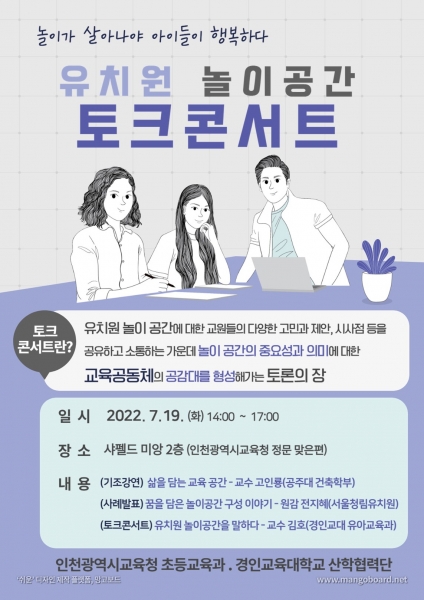 [충청뉴스큐] 인천광역시교육청이 주최하고 경인교대 산학협력단이 주관하는 ‘유치원 놀이공간 토크콘서트’가 19일 오후 2시, 샤펠드미앙 2층에서 열린다.