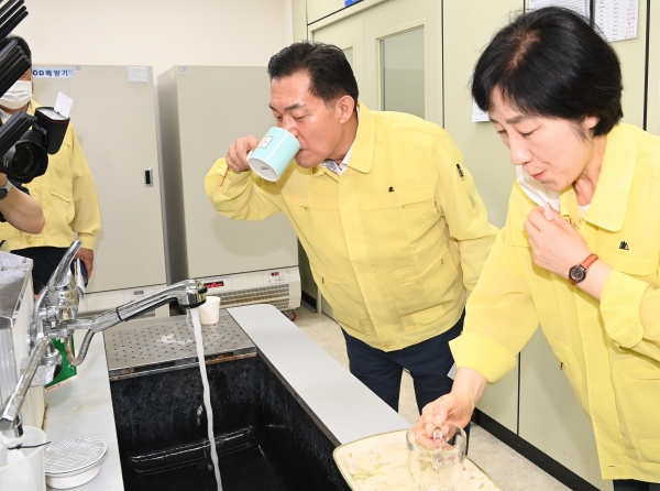 이재준 시장은 15일 한화진 환경부장관과 함께 수원시상수도사업소 정수 공정 현장을 점검했다.