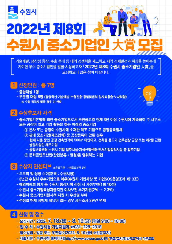 [충청뉴스큐] 수원시가 ‘제8회 수원시 중소기업인 大賞’ 후보자를 8월 19일까지 공모한다.