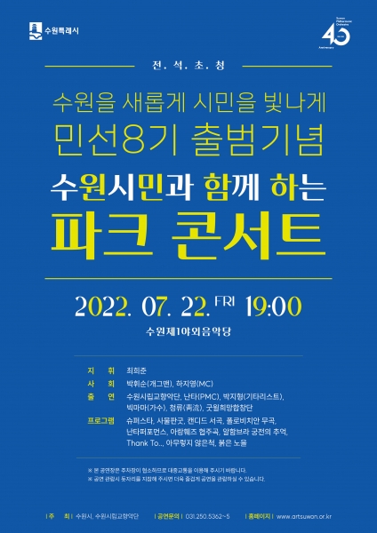 수원시는 오는 22일 오후 7시부터 9시까지 수원제1야외음악당에서 시민과 함께하는 파크콘서트를 개최한다.