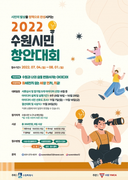 [충청뉴스큐] 수원시가 오는 8월 1일까지 ‘2022 수원시민 창안대회’ 아이디어를 공모한다.
