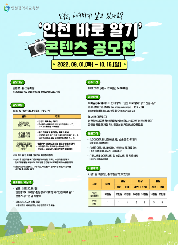 [충청뉴스큐] 인천광역시교육청은 인천에 대한 올바른 이해와 인천시민의 정체성 확립을 위한 ‘인천 바로 알기’ 콘텐츠 공모전을 개최한다고 밝혔다.