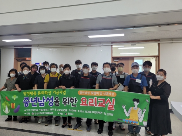 ‘중년남성 요리교실’은 2022년 안성시 양성평등문화확산사업으로 선정돼 이달 15일부터 오는 9월 2일까지 매주 금요일 총 8회기 과정으로 운영되며 중년남성과 맞벌이 남성 20명이 참여한다.