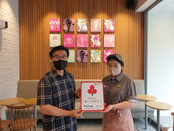 [충청뉴스큐] 평택행복나눔본부는 지난 15일 배스킨라빈스 평택동삭점에 착한 가게 현판을 전달했다.