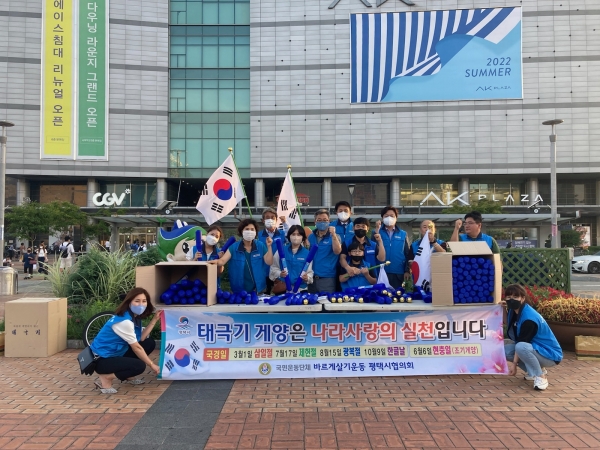 [충청뉴스큐] 평택시 바르게살기운동 신평동위원회는 지난 15일 평택역 앞에서 국경일 태극기 달기 운동에 동참해 줄 것을 당부하며 태극기 무료 나눠주기 행사를 진행했다.