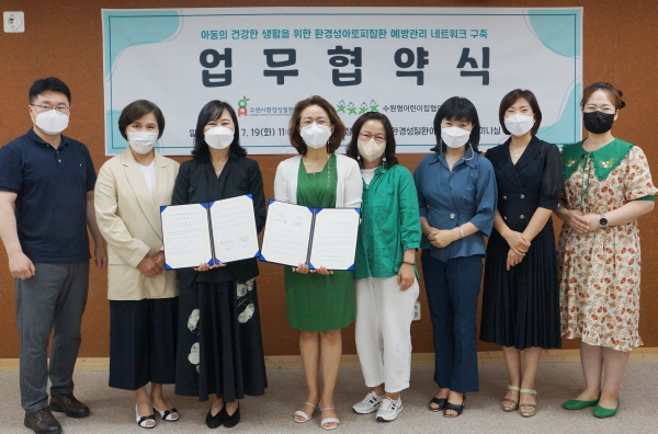 [충청뉴스큐] 수원시환경성질환아토피센터와 수원형어린이집협의회는 19일 아토피센터 2층 세미나실에서 ‘환경성 아토피질환 예방관리 네트워크 구축을 위한 업무협약’을 체결하고 협력을 약속했다.