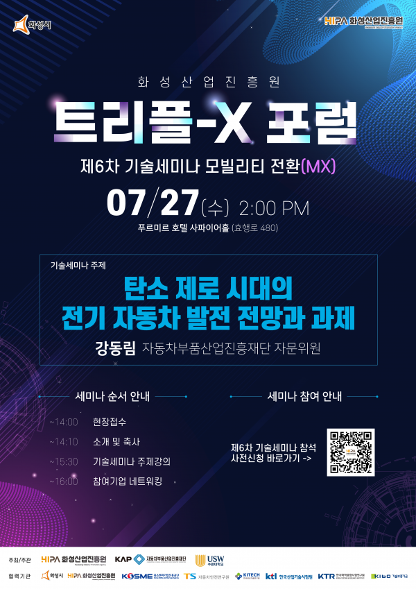 [충청뉴스큐] 화성산업진흥원은 오는 27일 오후 2시 푸르미르 호텔 사파이어홀에서 화성시 중견·중소기업 CEO 및 임직원을 대상으로 트리플-X 포럼 제6차 기술세미나를 개최한다.