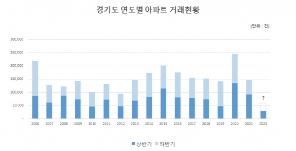 이 가운데 아파트 거래량은 경기도가 관련 통계 기록을 만들기 시작한 2006년 이후 최저치로 2008년 세계금융 위기 때보다도 낮은 2만9,334건을 기록, 거래량 급감의 주도적 역할을 했다.