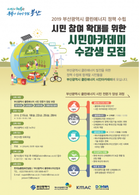 [충청뉴스큐] 부산시는 클린에너지 발전을 위한 정책 수립에 관심이 많은 시민들의 참여를 확대하기 위해 "2019 부산 클린에너지 시민아카데미"를 개최하며, 수강생을 공개 모집한다고 밝혔다.