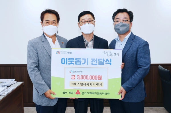 [충청뉴스큐] 안성시는 지난 19일 ㈜에스앤에이치이엔지로부터 이웃돕기 성금 300만원을 전달받았다고 밝혔다.