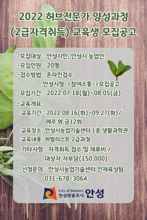 [충청뉴스큐] 안성시농업기술센터에서는 허브 활용 치유농업 전문가를 양성하기 위해 허브전문가 양성 교육을 마련하고 오는 8월 5일까지 ‘허벌리스트 2급 자격 취득 과정’ 교육생을 모집한다.