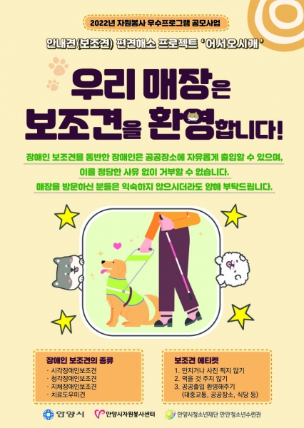 지난 16일에는 안양일번가 매장 30여 곳을 대상으로 청소년들이 기획 · 제작한 포스터와 스티커를 부착하는 포스팅 활동을 전개한 가운데, 포스터에는 장애인 보조견을 동반한 장애인은 공공장소 및 식당에 자유롭게 출입할 수 있다는 내용과 장애인 보조견의 종류, 보조견 에티켓에 대한 정보가 담겼다.