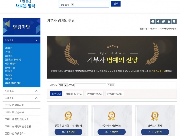 [충청뉴스큐] 평택시는 기부자의 소중한 뜻을 기리고 지속적인 나눔문화 확산을 위한 온라인 ‘명예의 전당'을 평택시 누리집에 25일 개설했다.