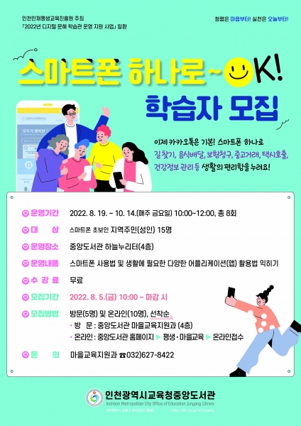 [충청뉴스큐] 인천광역시교육청중앙도서관은 8월 19일부터 10월 14일까지 매주 금요일 진행하는 ‘스마트폰 하나로~ OK’의 학습자를 모집한다.