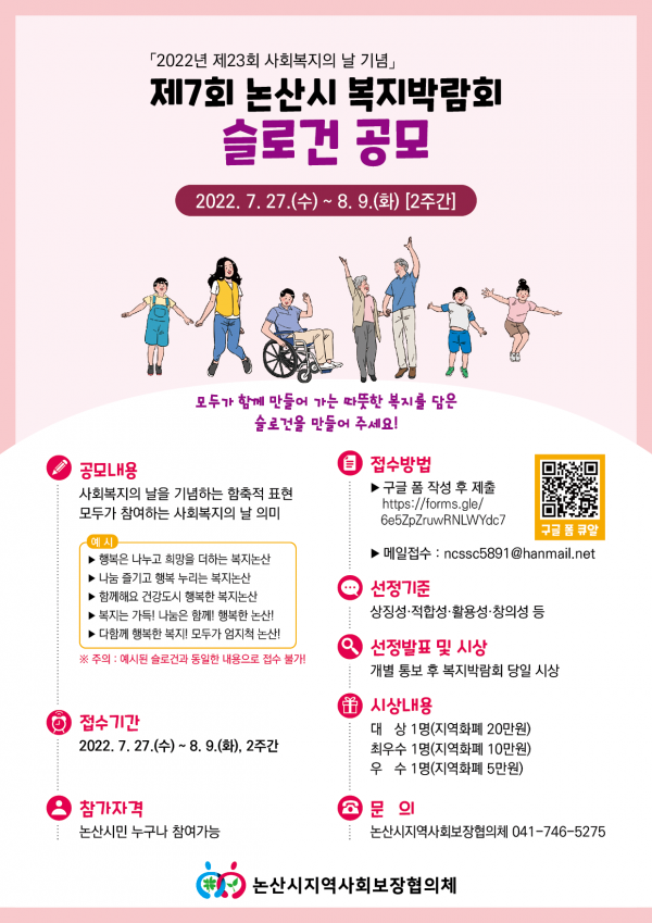 슬로건 공모에 참여하고자 하는 희망자는 홍보지의 구글 폼 주소 및 구글 폼 큐알코드를 통해 슬로건을 작성한 후 논산시지역사회보장협의체 메일로 제출하면 된다.
