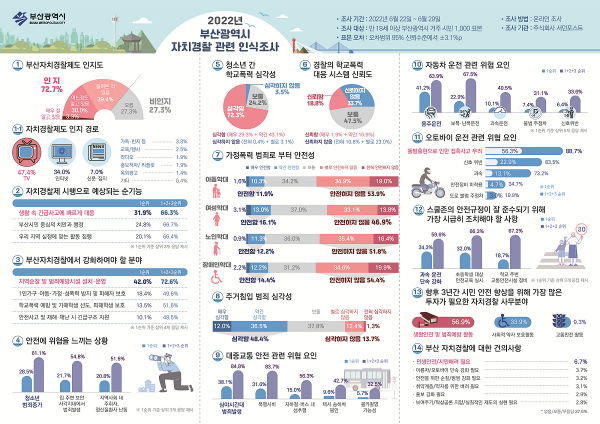 정용환 부산시 자치경찰위원장은 “자치경찰제에 대한 시민들의 기대감과 인식도가 높아진 것은 매우 긍정적이나 일상생활과 밀접한 다양한 분야에서 시민들의 우려가 여전한 만큼 이번 인식조사를 바탕으로 더욱 다양한 맞춤형 치안 정책을 추진해 시민 만족도를 획기적으로 높여 나가겠다”고 전했다.