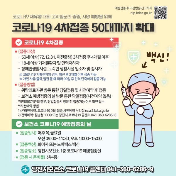 [충청뉴스큐] 당진시가 최근 전파력이 높은 신종변이의 확산으로 코로나19 감염병의 재유행에 대비, 50대 이상으로 대상자를 확대해 코로나 4차접종을 실시한다.