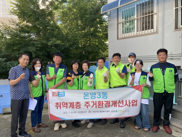 특히 이번 주거환경개선사업은 복지통장이 온양3동에 대상자의 상황을 알리고 이를 바탕으로 온양3동이 복지상담을 진행한 후, 아산 비전봉사단과 온양3동 행복키움추진단이 협력해 재능기부를 추진한 민관협력 복지 사각지대 해소 사례로 그 의미를 더했다.