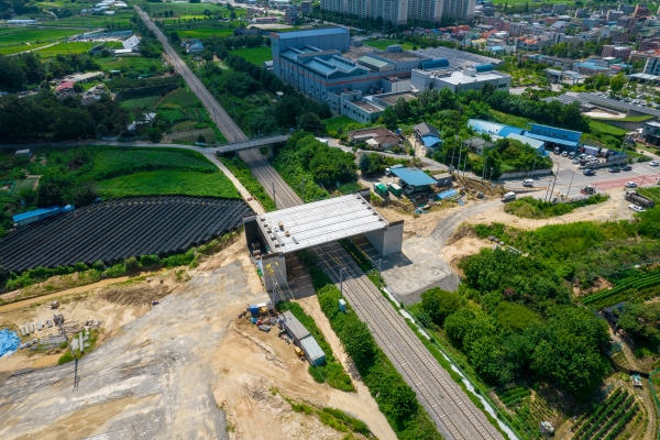 현재 공정율은 50%로 교량 상부공인 거더 거치 후 연결부 용접 및 슬라브 타설 작업을 마무리하고 교량 바닥 및 난간, 보강토 옹벽 설치 등 후속 공정을 연계 추진할 계획이라고 전했다.