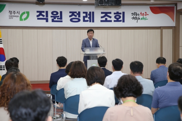 [충청뉴스큐] 이범석 청주시장은 1일 임시청사 대회의실에서 민선8기 첫 직원 정례조회를 열어 시정목표 실현을 위해 창의적·열성적으로 노력해 줄 것을 주문했다.