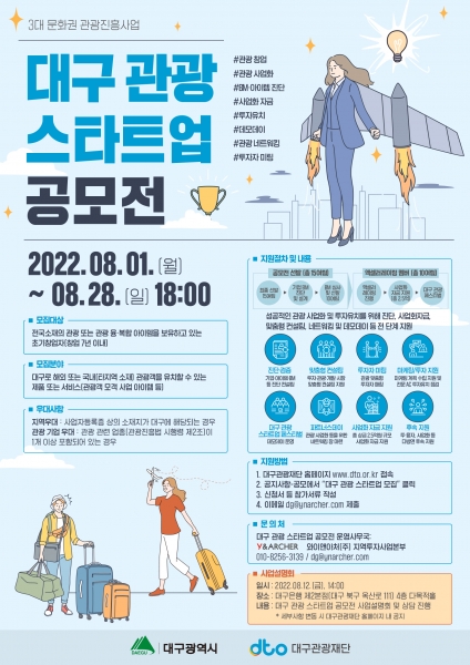 [충청뉴스큐] 대구시와 대구관광재단은 7년 미만 초기 창업자들의 3대문화의 현대적 재해석 및 창의적인 관광 콘텐츠 발굴과 코로나19 이후 관광분야 재개에 따른 외래 관광객 유치 활성화를 위해 제3기 대구 관광 스타트업을 공개 모집한다.