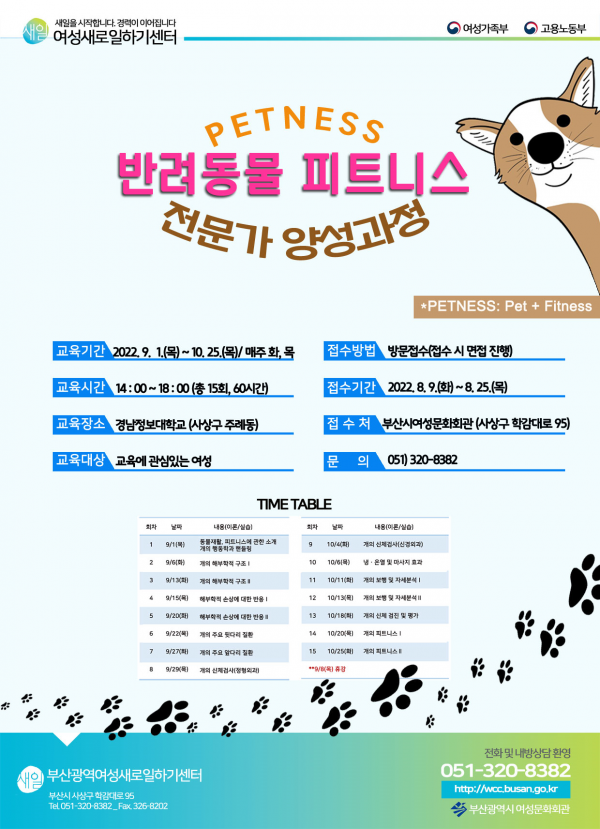 [충청뉴스큐] 부산시 여성문화회관은 오는 8월 9일부터 25일까지 반려동물 피트니스 전문가 양성교육 참가자를 모집한다고 밝혔다.