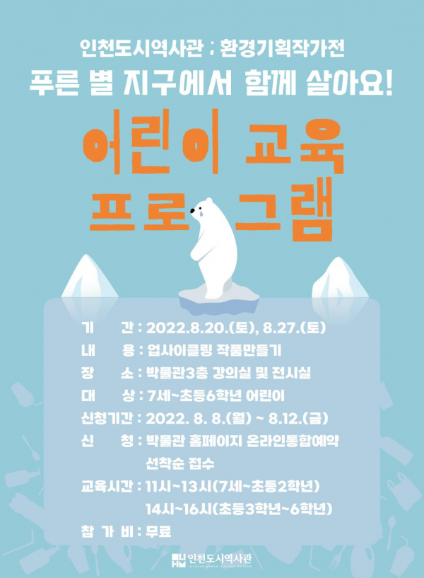 교육 신청은 8월 8일부터 12일까지 인천시립박물관 통합홈페이지를 통해 선착순으로 저학년, 고학년 각각 15명씩 신청 받으며 유치원생과 초등 저학년 학생들이 업사이클링 만들기 수업에 참여하기 위해서는 보호자의 도움이 필요하다이희인 시 인천도시역사관장은“환경기획 작가전 연계 교육프로그램을 통해 어린이들이 기후변화의 위기와 환경보존의 중요성을 인식하게 되는 계기가 되길 바란다”고 말했다.