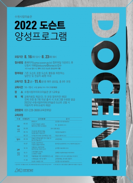 [충청뉴스큐] 수원시립미술관은 도슨트를 희망하는 성인 대상 ‘SUMA 도슨트 양성교육’ 수강생을 8월 16일부터 모집한다.