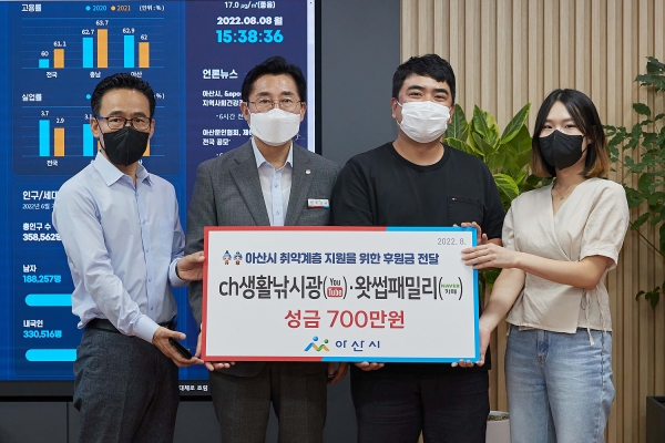 [충청뉴스큐] ch생활낚시광·왓썹패밀리가 지난 8일 아산시에 취약계층 아동 지원 성금 700만원을 기부했다.