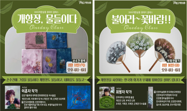 8월 11일 :‘염색디자인’‘개항장, 물들이다’ 8월 16일 :‘부채만들기’‘불어라 꽃바람’ 8월 18일 :‘테라코타’‘춤추는 물고기’ 8월 23일 25일 :‘어반스케치’‘펜화와 만나는 개항장’의 주제로 강의가 진행되며 차수별 참여인원은 15명 이내, 선착순으로 모집한다.