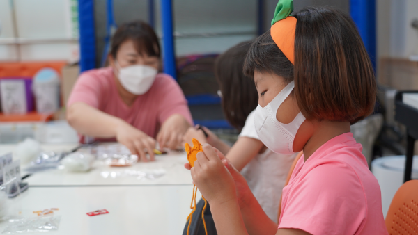 초등학교 1, 2학년 아이들이 작은 손으로 플라스틱 바늘을 이리저리 움직여 열쇠고리 하나씩 뚝딱 만들어낸다.