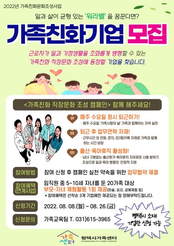 [충청뉴스큐] 평택시가족센터에서는 2022년 가족친화문화조성사업의 일환으로 8월 8일부터 26일까지 3주간 평택시 소재 기업 대상‘가족친화기업 발굴 캠페인’을 실시한다.