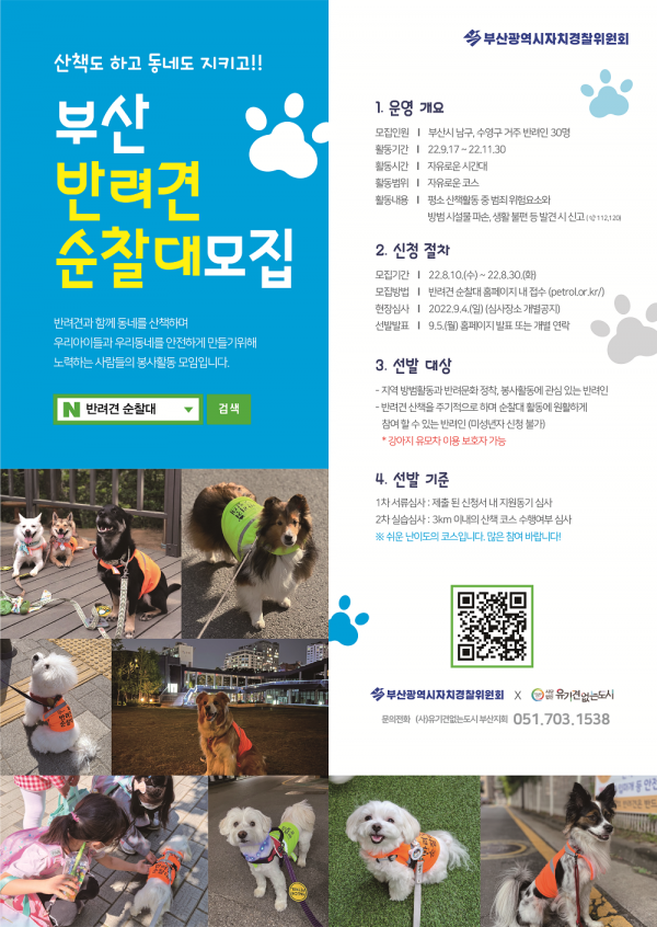 [충청뉴스큐] 부산시 자치경찰위원회는 시민과 함께하는 맞춤형 치안정책으로 반려견과 함께 산책하면서 지역 방범 활동을 펼치는 '부산 반려견 순찰대'를 시범 운영하고 참가자를 오는 30일까지 모집한다고 밝혔다.