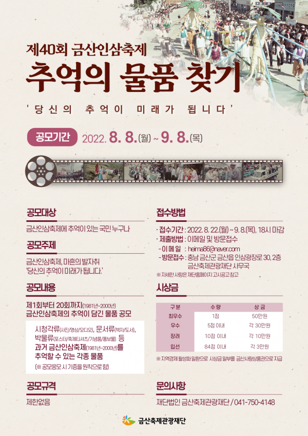 [충청뉴스큐] 금산축제관광재단은 제40회 금산인삼축제를 맞아 축제의 추억을 되돌아보는 시간을 가지고자 전 국민을 대상으로 추억의 물품 찾기 공모전을 개최한다.